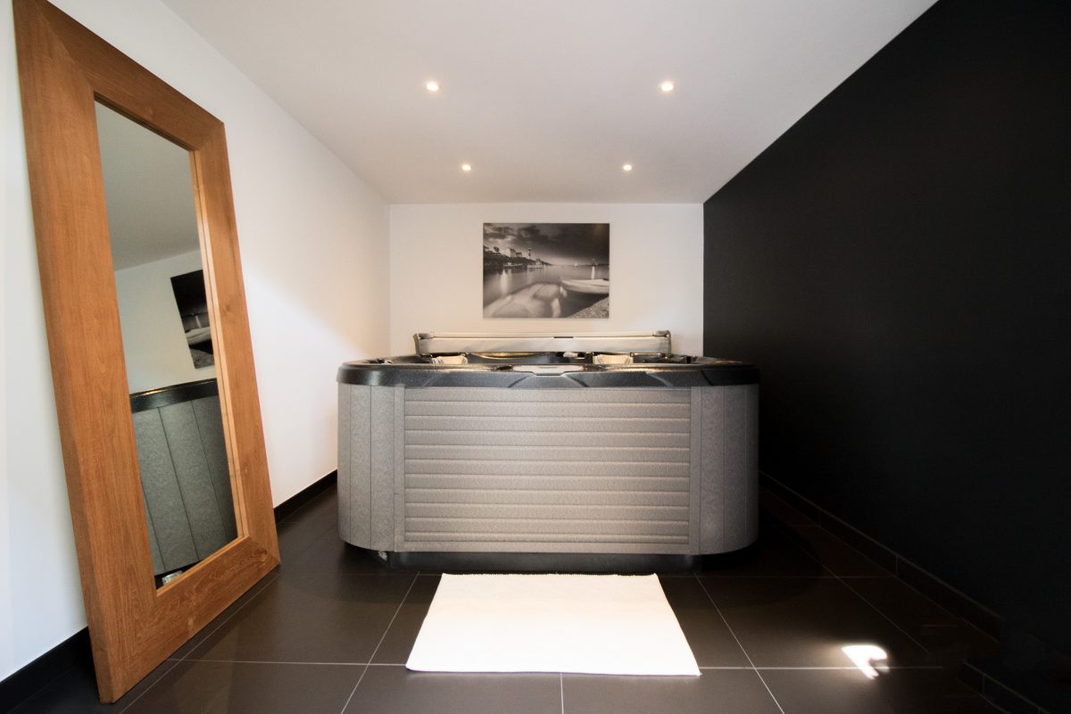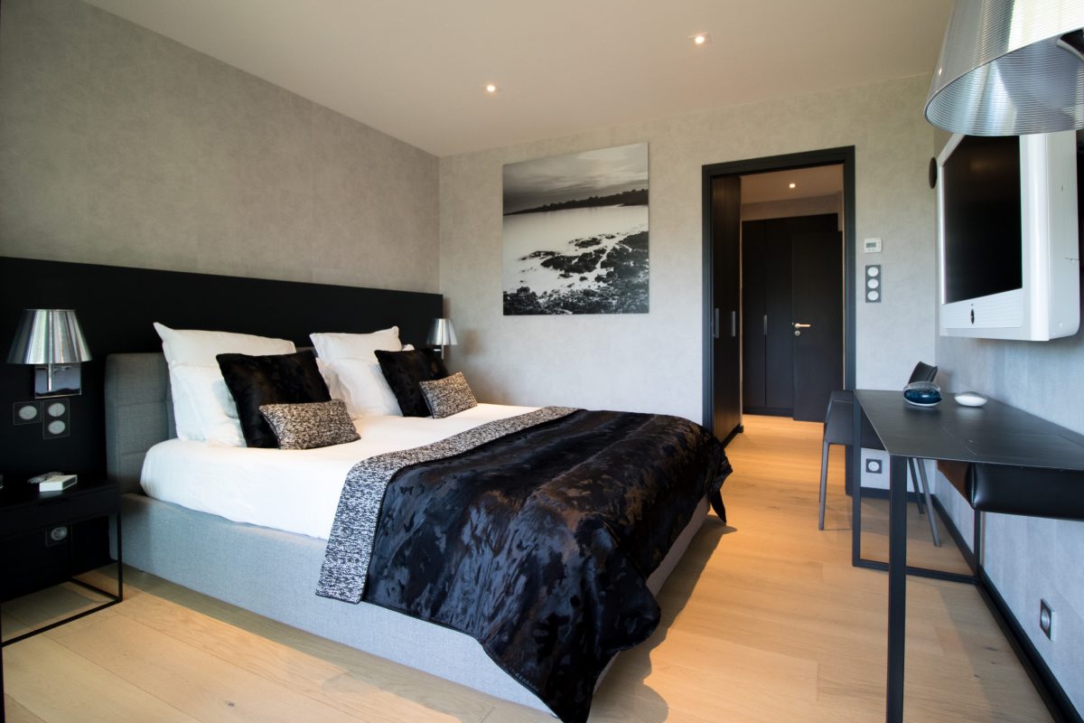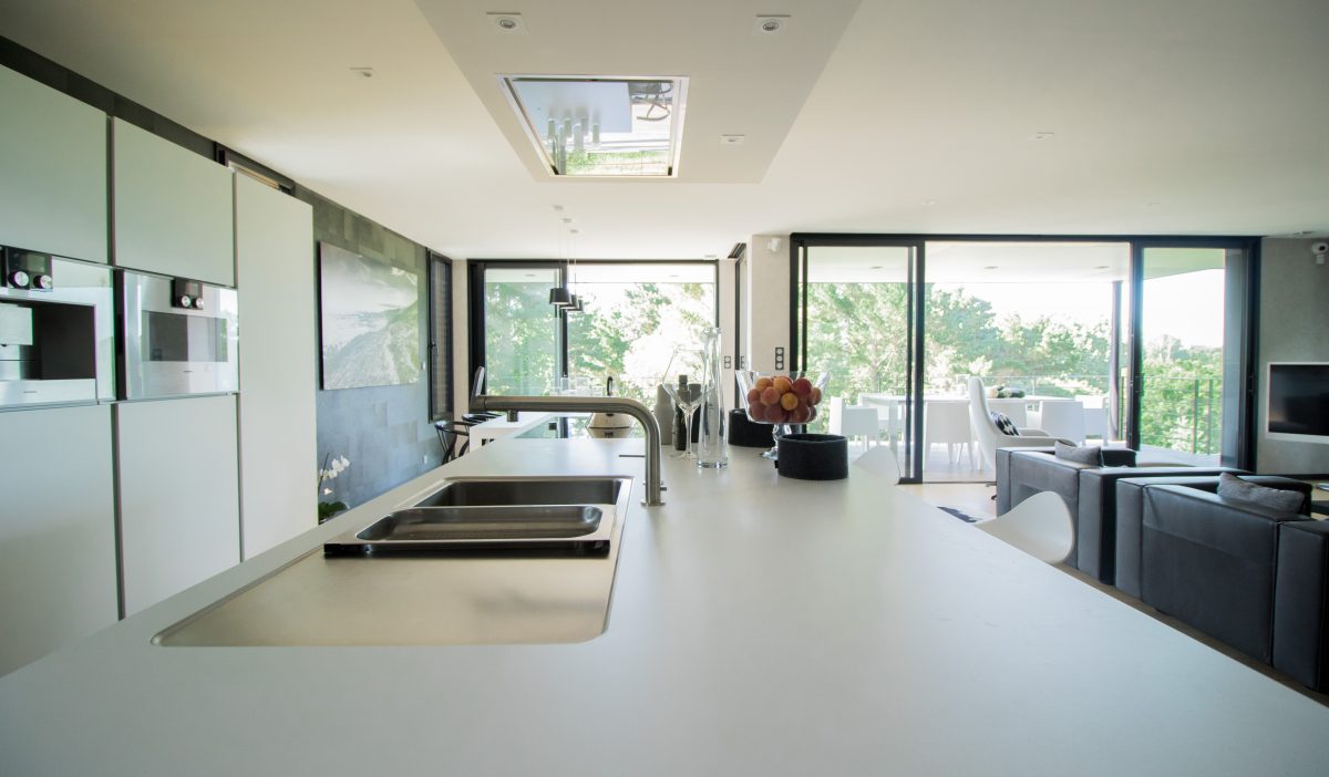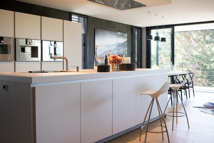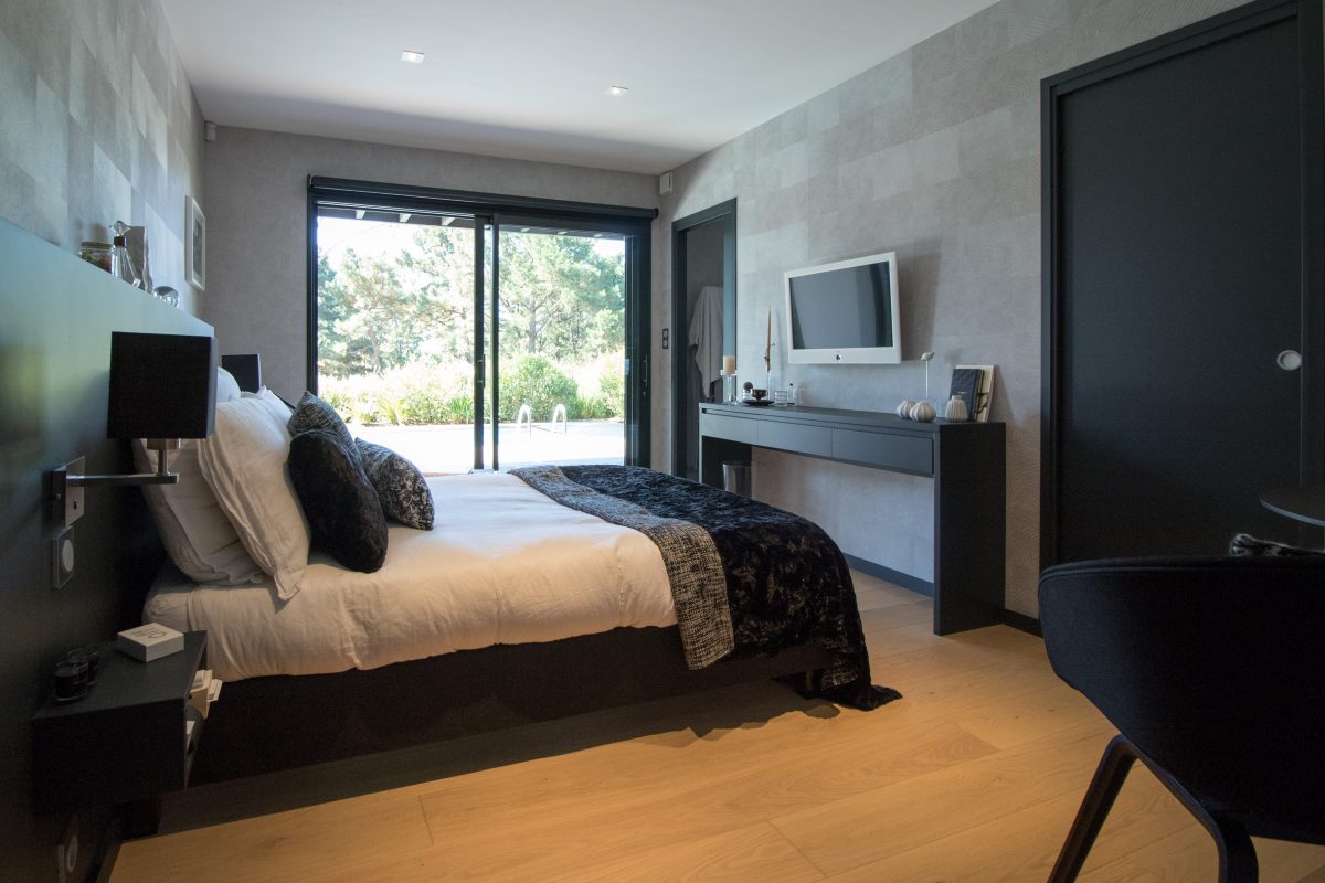 L’accès à la propriété se fait via une passerelle enjambant le patio dans lequel s’épanouit un chêne liège. La pièce de vie est un open-space répartissant un espace cuisine (Bulthaup équipée Gaggenau), arrière-cuisine, et un séjour au volume confortable. Dans l’ensemble de la maison l’on retrouve un papier peint texturé de la marque Elitis. Des baies toutes hauteurs jouent les prolongations avec la terrasse couverte, dominant la vallée boisée. Un bureau situé au même niveau pourra tout aussi bien être envisagé en chambre à coucher. Enfin, une vaste suite parentale avec dressing, salle d’eau/wc privatif et terrasse intimiste se révèle être une belle surprise. A l’étage inférieur l’on retrouve deux suites donnant sur la piscine, ayant chacune un dressing et une salle d’eau/wc. Un spa cinq personnes ouvert sur le patio invite à la détente… Pour le côté pratique, une lingerie, un wc et deux pièces de stockage/bricolage donnent également sur le rez-de-jardin.