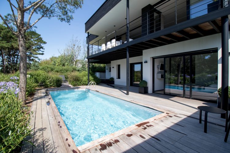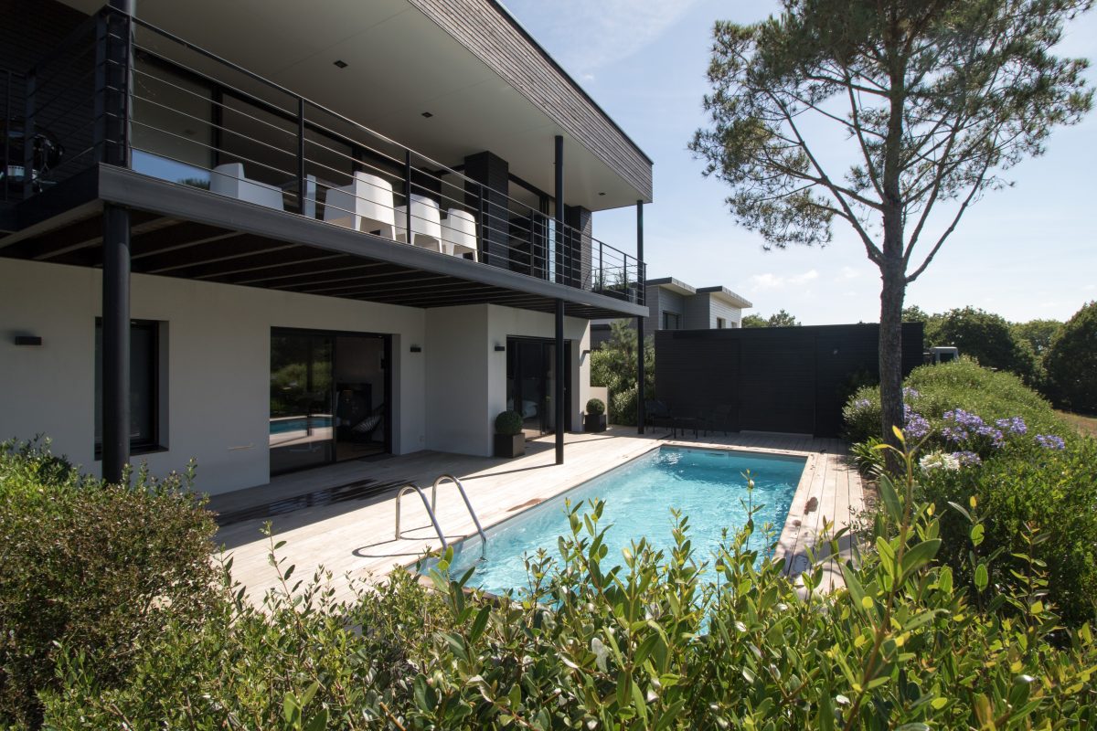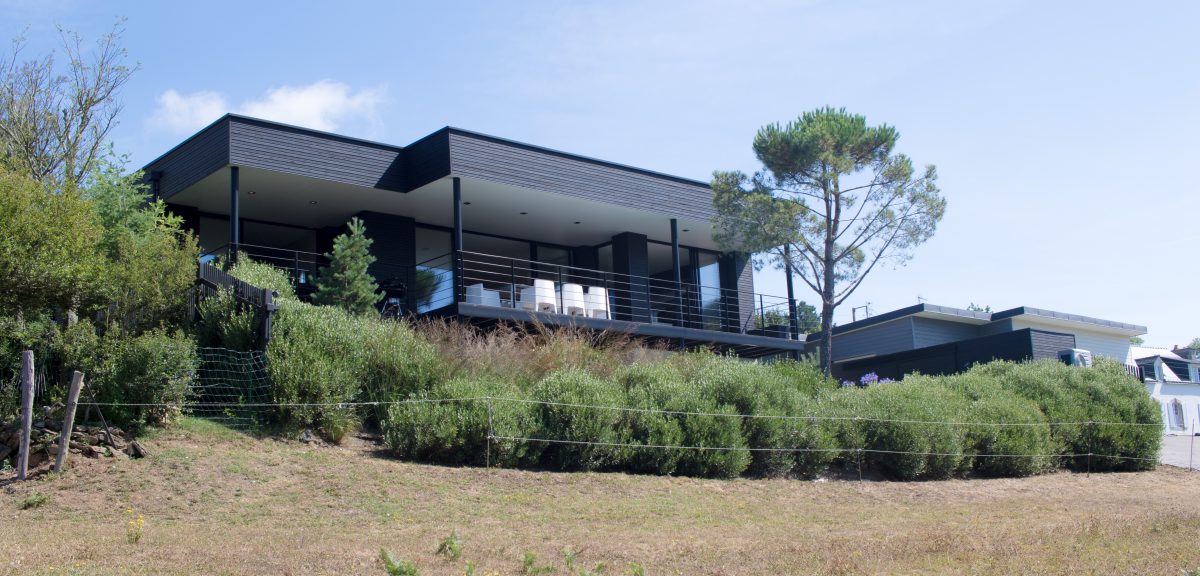 C’est en surplomb d’une vallée bordée de pins que s’érige cette villa résolument contemporaine à l’architecture racée : cubisme et bois noir, contrastant avec un écrin de verdure paysagé.