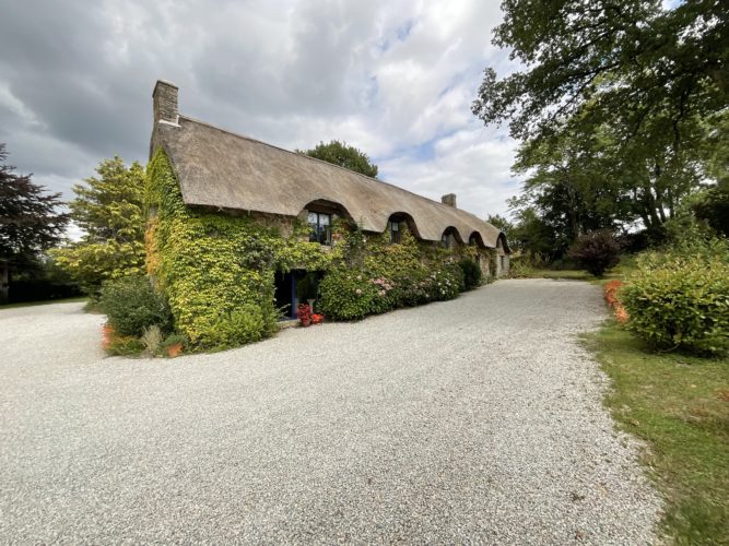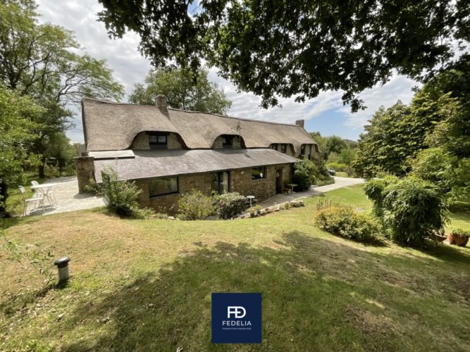 Édifiée au XVIIe siècle et coiffée d’un toit de chaume soigneusement entretenu, cette propriété unique offre 300 m² habitables sur un vaste terrain arboré et paysager d’environ 2 400 m².