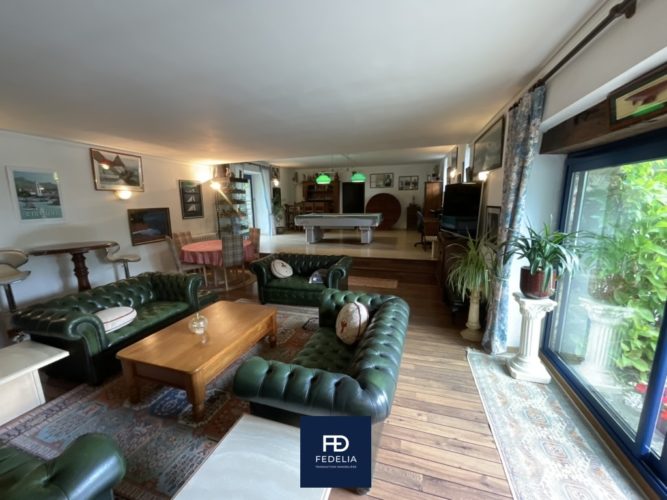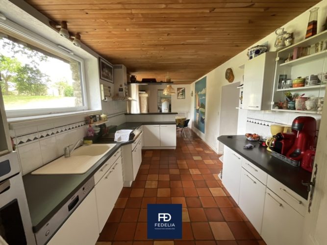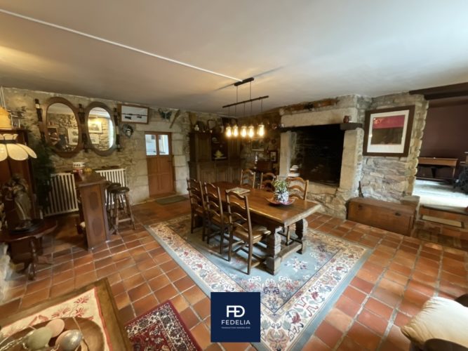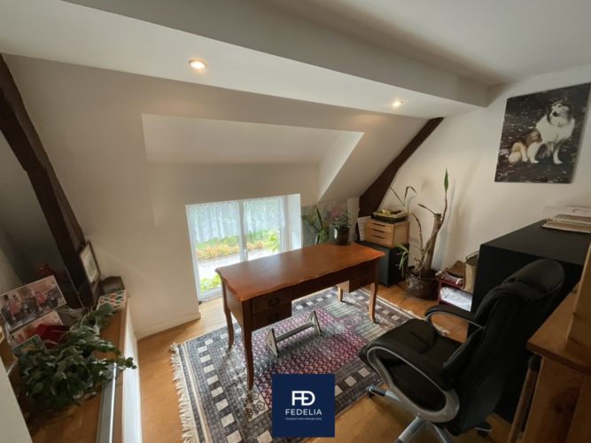 L’intérieur dévoile des volumes généreux et lumineux. Le rez-de-chaussée propose une entrée accueillante, une cuisine aménagée et équipée avec une arrière-cuisine, un grand séjour avec une cheminée, deux salons conviviaux, un bureau, ainsi qu’une salle d’eau contemporaine avec douche à l’italienne et WC.